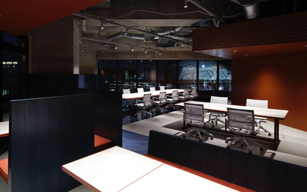 施設は約465㎡のワンフロア構成です。片側には外部に面した全面ガラスウォールが広がり、反対側には会議室や受付カウンターを配置。