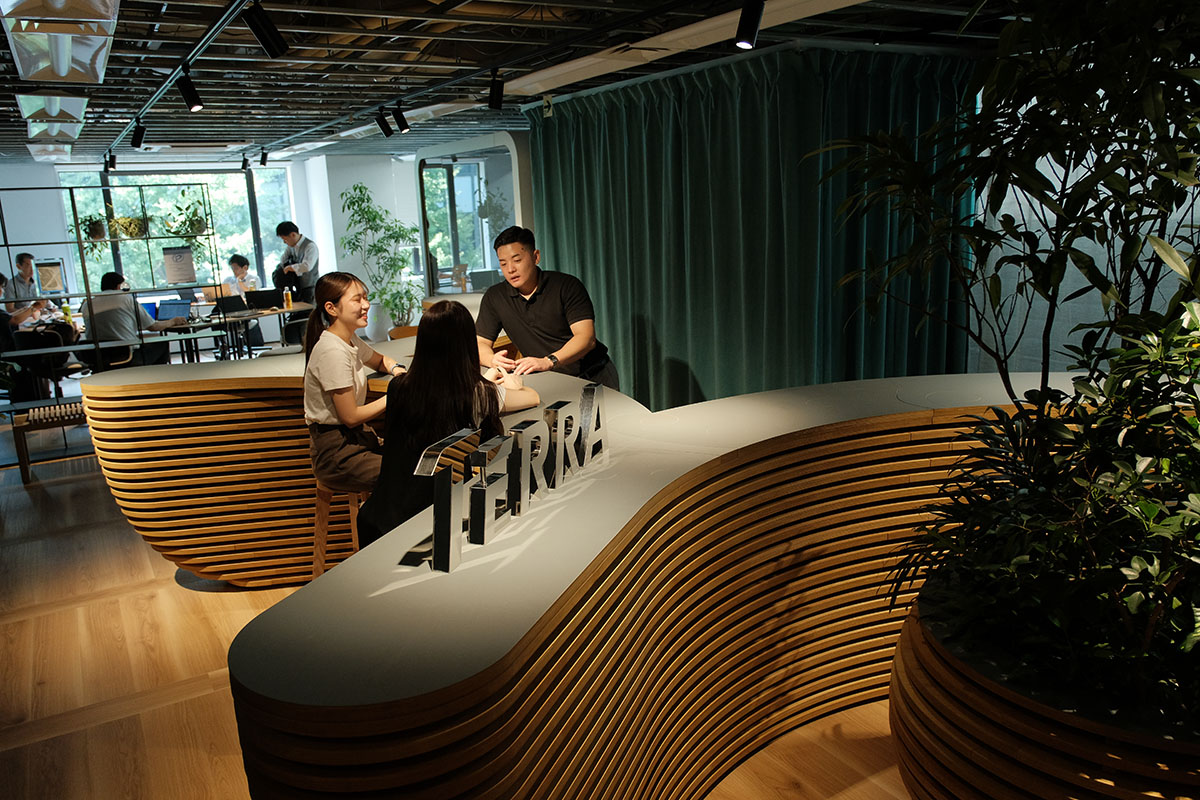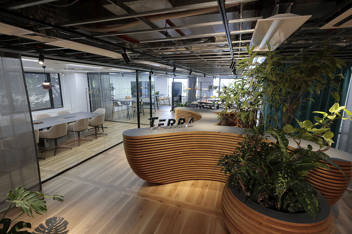 横浜馬車道に構えた株式会社テラの新オフィスでは、社のモットーでもある「社会に風を起こそう」を空間体験として形に落とし込んでいる。大きな風ではなくゆらりとした微かな空気の揺れ。当たり前の現象と言ってしまえばそれまでだが、間接視野に入ってくるその小さな変化が、ふとした瞬間「自分が動いて働いて風を起こすんだ」という企業コンセプトを思い出させてくれることを期待している。