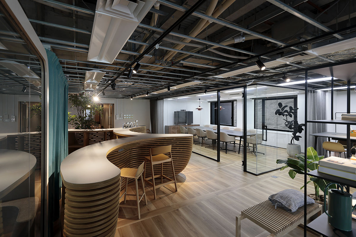 湾曲型のカウンターは“風”や“人をはぐくむストーリー”を着想にした、思い入れのあるオリジナル家具。スタッフの皆さまが、用途を工夫しながら愛着をもって使っていただけているそうだ。こうした「気づき」や「愛着」がモチベーションや愛社性を上げてくれることを意図して設計した。
