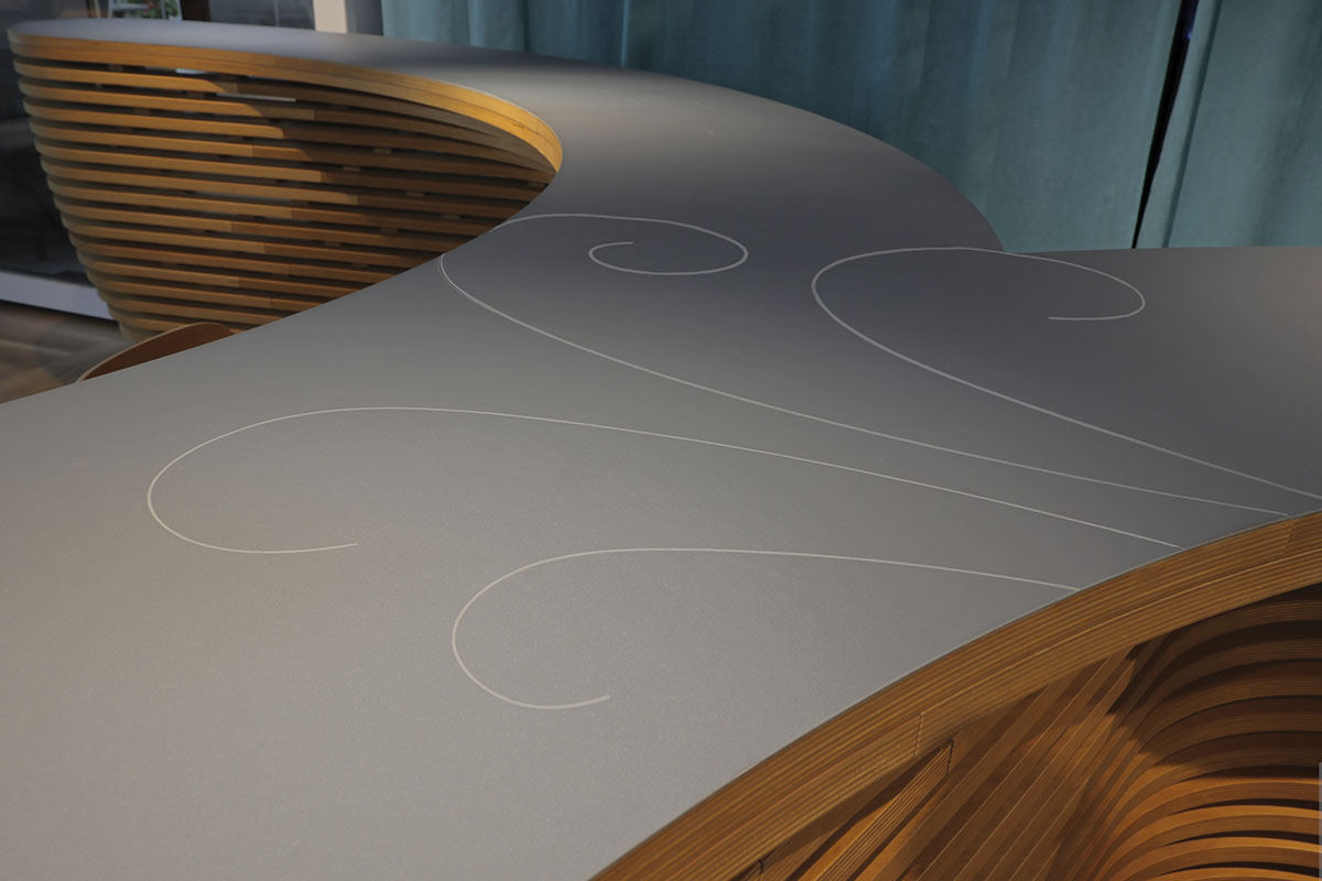 天板はユニットごとに製作するため、当然継ぎ目が出てくるのだが、あえて継ぎ目を利用して風の紋様をデザインした。VUILDのデジタルファブリケーションで製作するため、躊躇なくグニョグニョとしたデザインを採用できた。