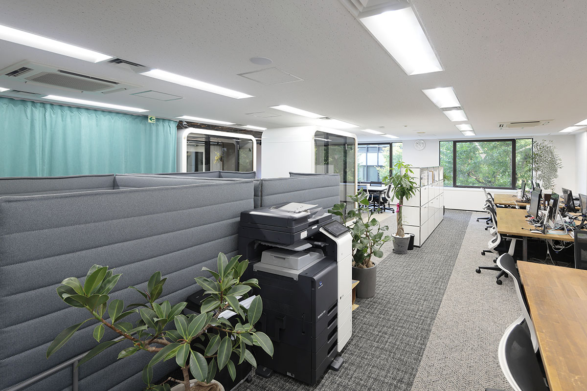 本オフィスではふんだんに植栽を計画したが、毎日水やりして植物を愛でることも大事なスタッフの日課となっているそうだ。カーテンのそよぎもしかり、ちょっとした気づきが大事なのだ。同じように“ひと”を大事にするこの会社で、スタッフひとりひとりをお互いに気遣いし合える雰囲気が醸成されることが楽しみである。