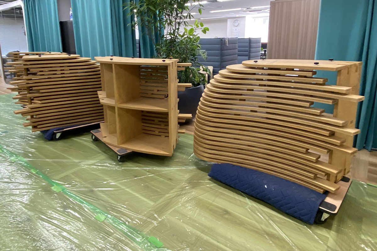 クライアントの懸念として、オフィス移転のたびに購入した家具が倉庫に眠り、造作家具が廃棄になるサイクルをどうにかしたいという課題があった。たしかにエコロジーの観点からもコストの観点からも必要以上の無駄は省きたい。