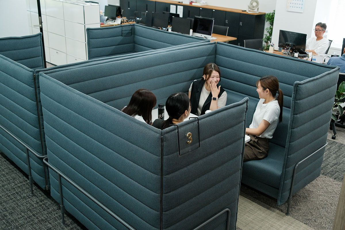 また、4人用ソファミーティング家具は、周りからの視線と音を低減し、程よい囲われ感がある。ひとり作業や、新人2~3人へ指導の場としても活用されている。閉鎖的な会議室はガラス張りの一室にとどめ、オフィス全体に”接点”の場をちりばめた。スタッフ一人ひとりが、その日の気分や業務に合わせて場所を選び、使い方を工夫しながら空間を使いこなしてほしいと思っている。