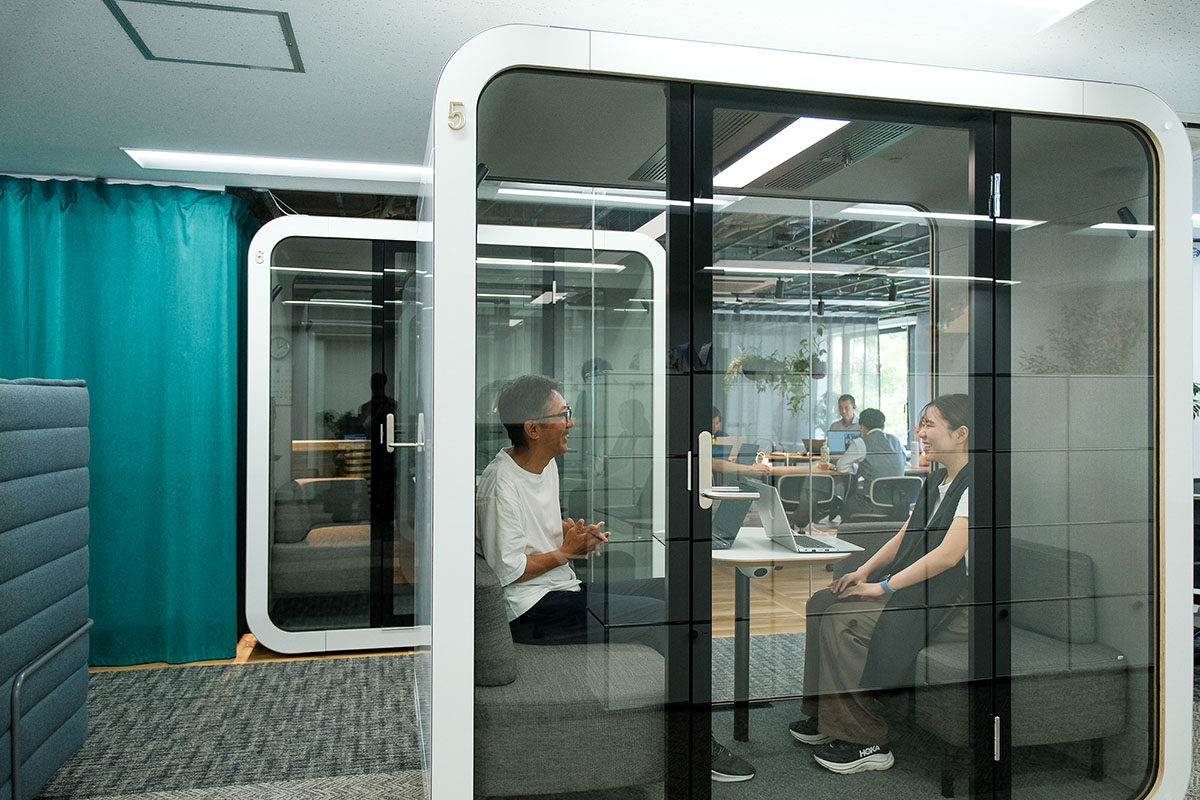 ガラス張りのフォンブースは、視線が抜けながらも防音性が高く、社外秘の打ち合わせにも安心して利用できる。