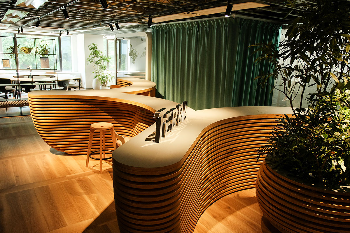 空間の中心にはわたしたちが“風冠カウンター”と呼んでいる漢字の風冠のような平面形状の湾曲カウンターがあり、気軽なコミュニケーションやライトワークの場所となると同時に、同じ形式で作られた植栽鉢植えとともにエントランスの顔となっている。
